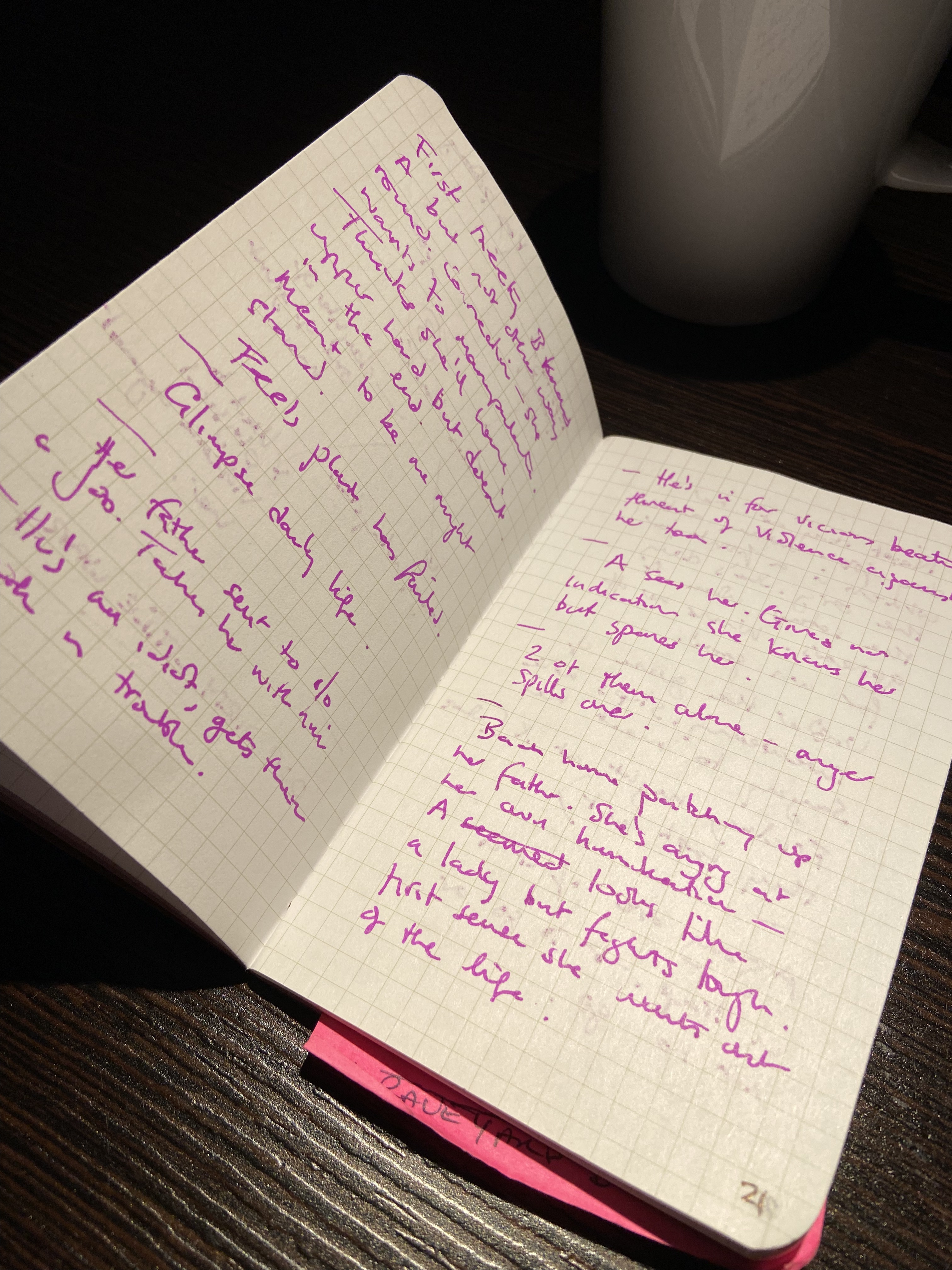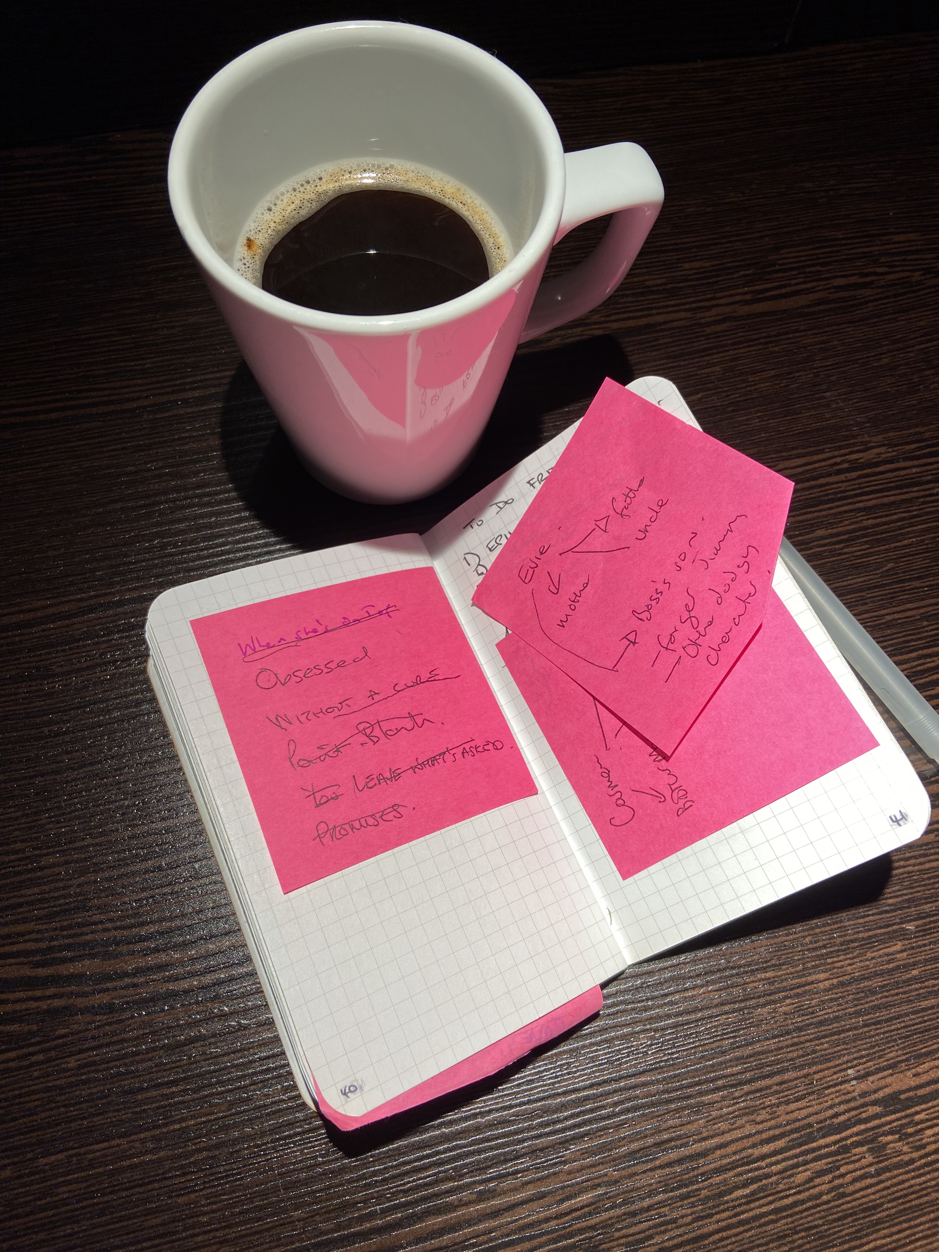 …[I found] a grimy pub that didn’t feel entirely safe, but did free coffee refills. I pulled out a notebook – a Field Notes book I can still picture clearly – and, inspired by that place, I came up with the entire plot in about an hour.