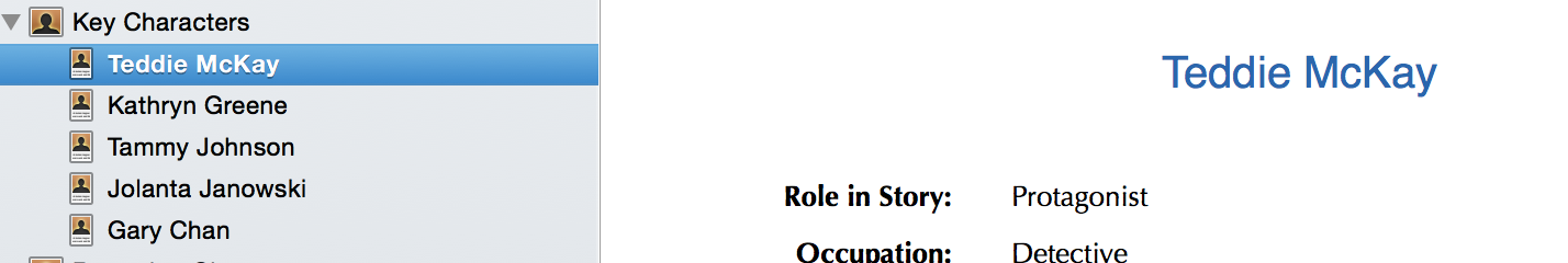I love the character template feature. As Teddie McKay is back again for a second instalment, I can just copy the template from The Crochet Killer straight into the new setup and we’re good to go: