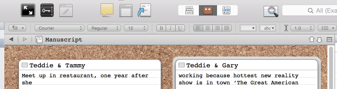 This is a huge benefit if you’re a plotter like me. I have all my scenes planned out, then I can put them together in cork board view. Like a real cork board, I can see the overall picture in one place, and move around anything I need.